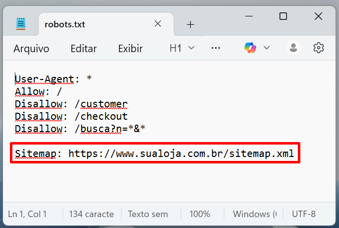 2. Com o arquivo no seu computador, substitua o campo Sitemap pelo domínio da sua loja. Confira um exemplo: