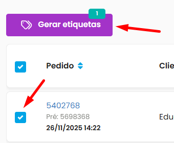 Para isso, selecione o pedido do lado esquerdo e depois clique em Gerar etiquetas