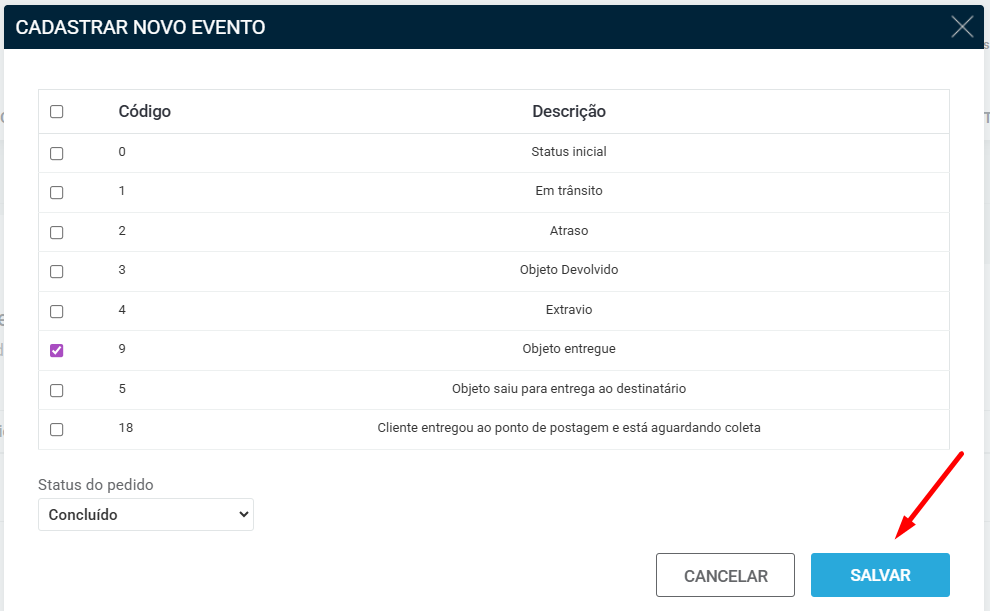 Passo 3 – Clique o evento que deseja cadastrar, por exemplo Objeto entregue