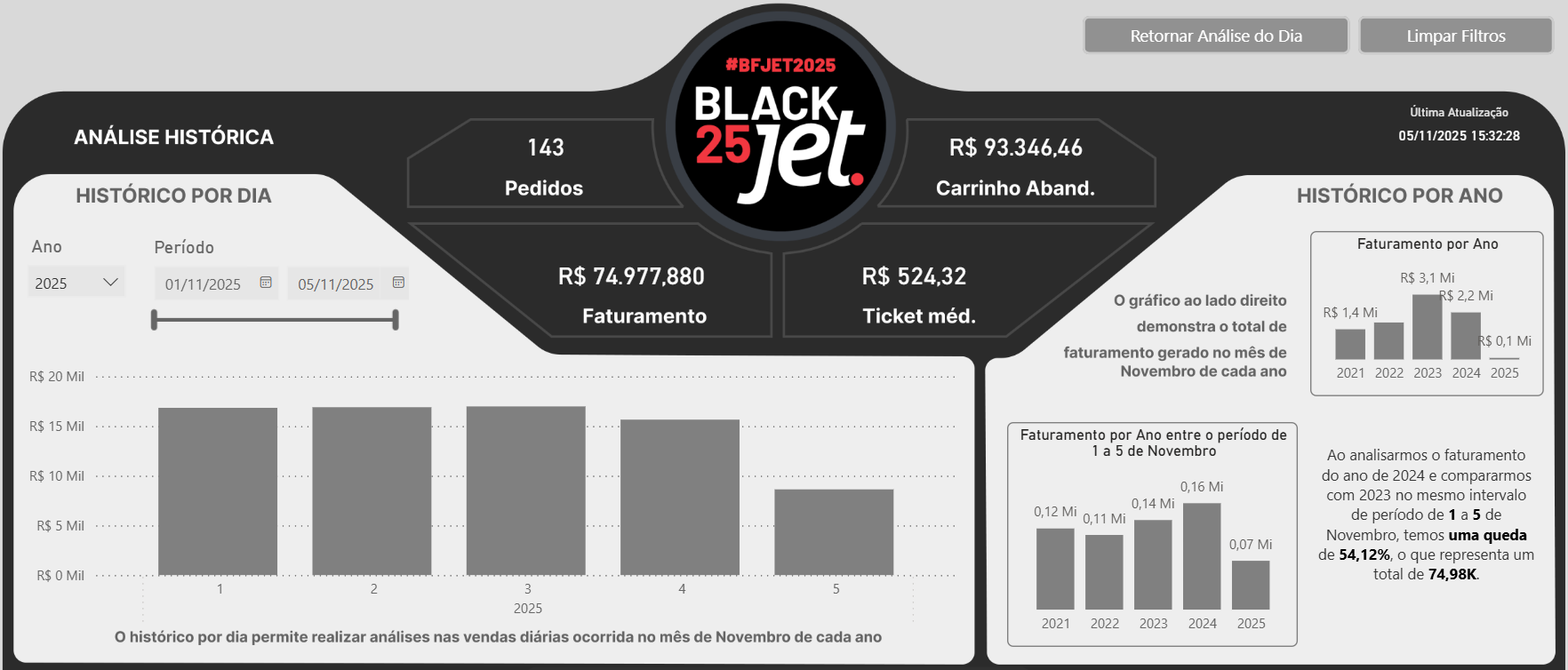 O relatório exclusivo para a Black Friday 2025, que estará disponível durante o mês de novembro, oferece informações essenciais para impulsionar o sucesso nas vendas, com duas visões distintas: Análise do Dia e Histórico de Vendas.