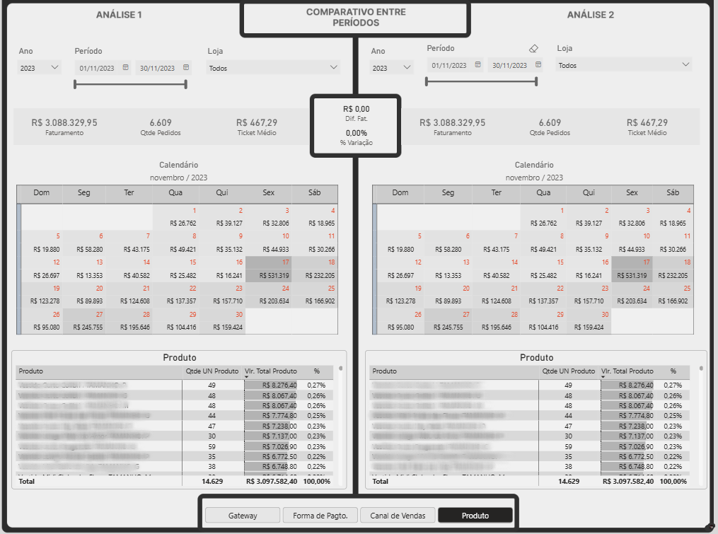 – Comparativo entre períodos que possibilitam escolher a visão entre gateways, formas de pagamento, canais de venda e/ou produtos.