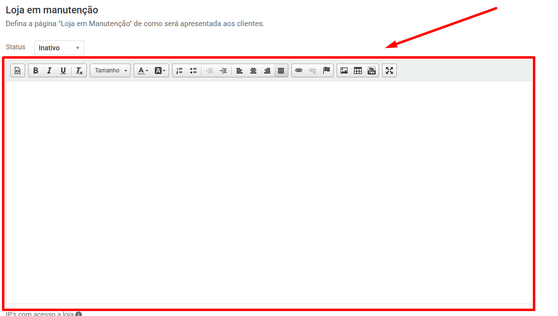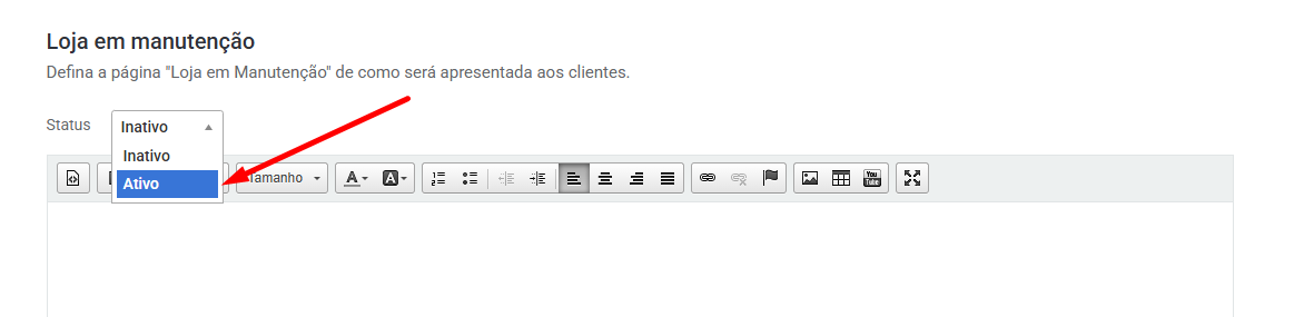 1 – O primeiro passo é cadastrar a mensagem que será exibida para os visitantes. Para isso, utilize o campo de texto, conforme destacado na imagem. Nele, você poderá inserir e formatar o conteúdo que será apresentado na página de manutenção da loja: