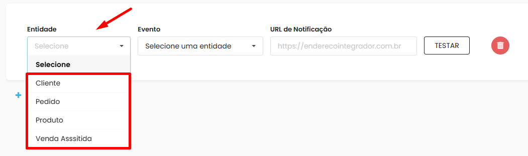 Selecione a Entidade, podendo ser Cliente, Pedido, Produto ou Venda assistida: